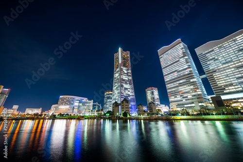 © voyata, Naklejka premium city skyline looking up night view in Yokohama