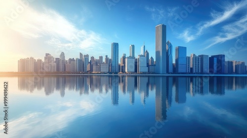 Obraz premium City skyline mirrored on a calm water surface