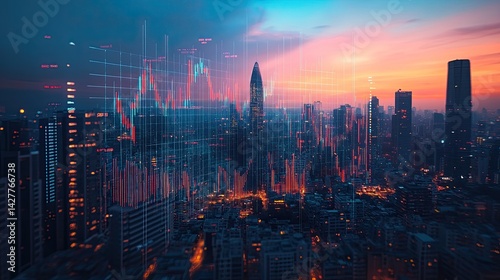 Fototapeta premium City Skyline Model with Overlaid Graphs, Highlighting Business and Growth -