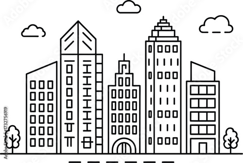 Fototapeta premium City skyline outline drawing with tall buildings and trees urban landscape view