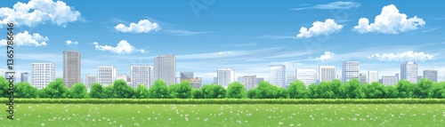 Fototapeta premium City skyline, park, meadow, sunny day, idyllic urban landscape