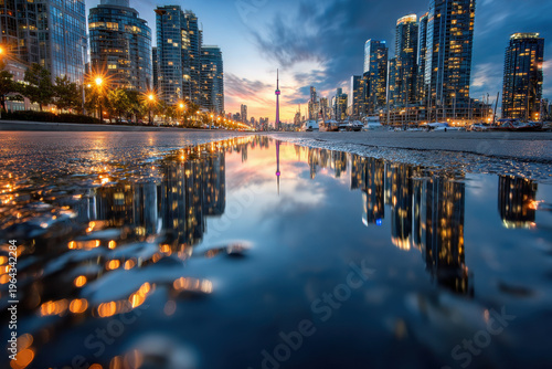 © YouraPechkin, Fototapeta premium City Skyline Reflected in a Puddle at Dusk