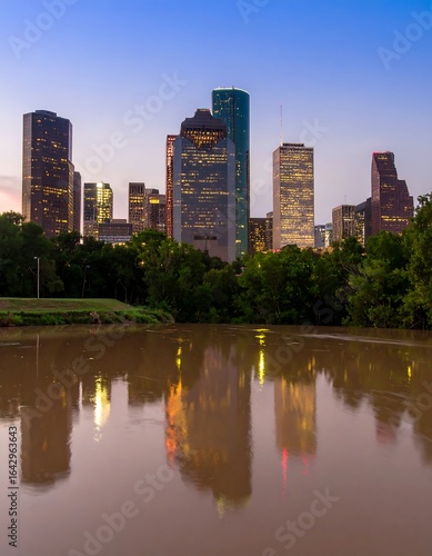 Naklejka premium City skyline reflected in calm, murky water at dusk