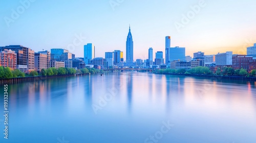Fototapeta premium City skyline reflected in calm river at dawn.