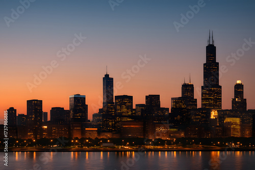 © paisan191, Obraz premium City skyline reflected in calm river at dusk background