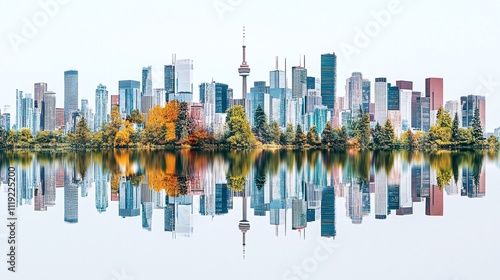 © mifta, Obraz premium City skyline reflected in calm water, autumn foliage. Generative ai