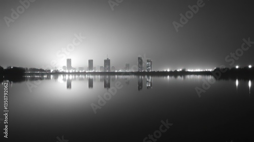 © falikh, Fototapeta premium City skyline reflected in tranquil lake at night