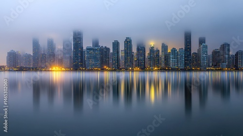 © musthofa, Obraz premium City skyline reflected in tranquil waters at dawn.