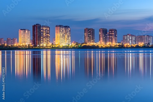 © senyumanmu, Fototapeta premium City Skyline Reflected in Water at Dusk