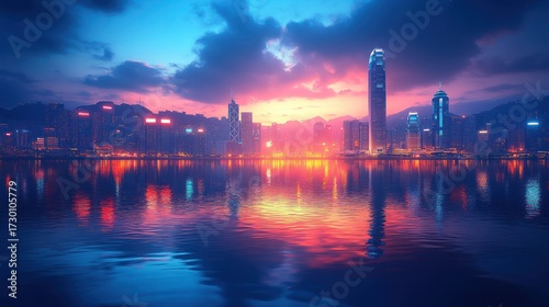© bayuaji, Naklejka premium City skyline reflected in water at dusk with colorful sunset hues