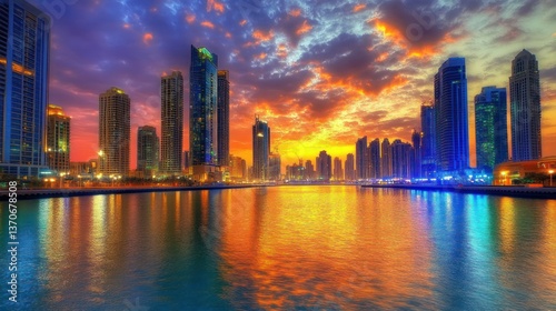 © embun, Fototapeta premium City skyline reflecting in tranquil water at beautiful sunset