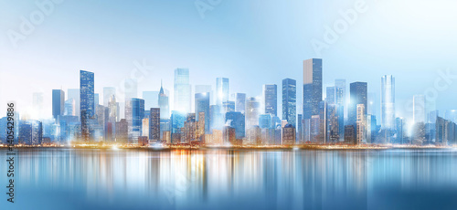 © sam richter, Naklejka premium City skyline reflecting on water at dusk