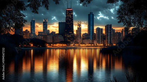 Naklejka premium City Skyline Reflection in Water - Realistic Image