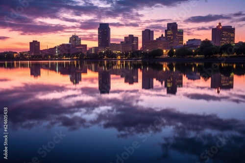 Fototapeta premium city skyline reflection on calm river during twilight hours, created with generative ai