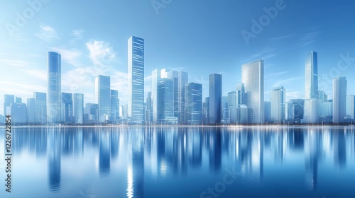 © SerPhoto, Fototapeta premium City skyline reflects on calm waters under a clear blue sky with modern architecture and futuristic buildings