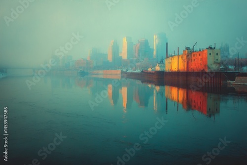 Naklejka premium City skyline reflects on water with fog, featuring buildings and industrial...