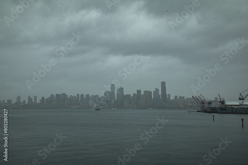 Fototapeta premium City skyline seen from harbor with many tall buildings in the background