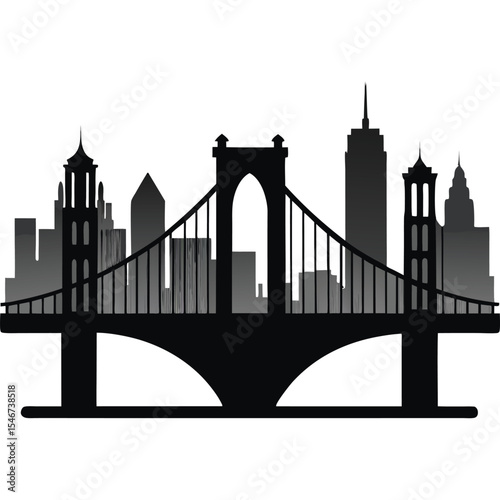 Obraz premium City skyline silhouette featuring a bridge and various buildings isolated on white background