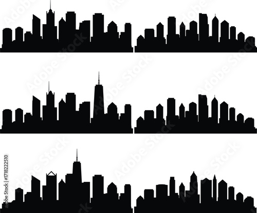 © Lotus, Naklejka premium City skyline silhouette, urban skyscraper outline vector, modern cityscape illustration, metropolitan skyline design, downtown building silhouette, architecture landmark