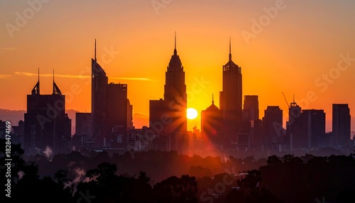 © Reni, Fototapeta premium City skyline silhouetted by a bright, vibrant sunrise with orange hues