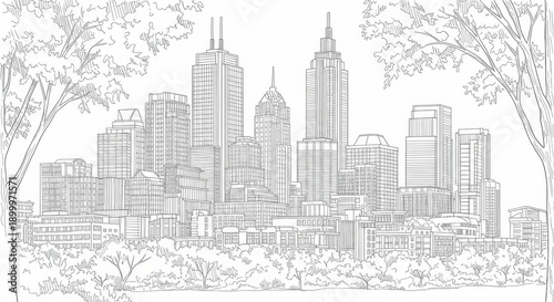 Fototapeta premium City Skyline Sketch Illustration with Modern Buildings and Urban Trees