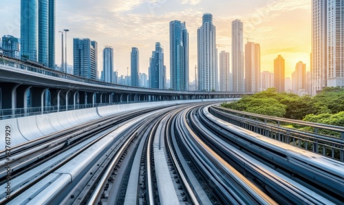 Obraz premium City skyline sunrise, elevated train tracks curving through urban landscape