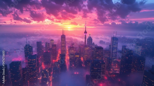 © Ali, Fototapeta premium City skyline sunset, fog, vibrant colors.