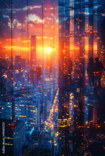 © Vadim, Naklejka premium City Skyline Sunset View. Silhouettes of two people stand on a skyscraper balcony, overlooking a cityscape bathed in the warm glow of sunset.