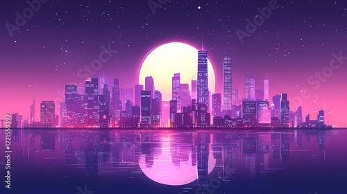 © Thiago, Fototapeta premium City skyline under a large moon at night with water. Heavenly Harbor. Illustration