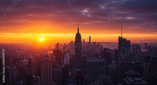 © Sabex Art, Naklejka premium City Skyline View at Sunset with Vibrant Sky and Building Silhouettes