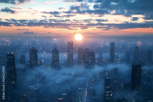 Fototapeta premium City skyline view with clouds and overcast sky at dusk or dawn with urban...