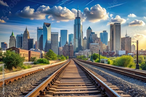 © chaiwat, Fototapeta premium City skyline view with train tracks in foreground, blurred background