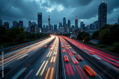 © RESTY, Fototapeta premium City skyline views featuring traffic on a busy highway at night