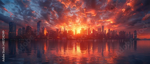 © Starkreal, Obraz premium City skyline with a dramatic sunset and reflecting water