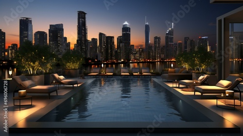 Obraz premium City skyline with a rooftop swimming pool. A modern and luxurious depiction...
