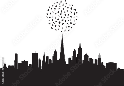 © VectoraVerse, Fototapeta premium city skyline with birds in heart shape silhouette