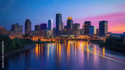 Naklejka premium City skyline with light trails and glowing buildings at dusk