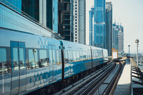 Fototapeta premium City skyline with metro train running along elevated railway tracks,...