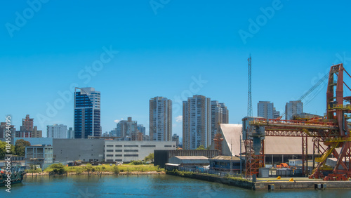 Naklejka premium City skyline with modern high-rises behind an industrial port and calm blue water under a clear sky on a sunny day