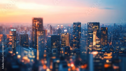 © Lilly, Fototapeta premium City skyline with modern skyscrapers and glowing lights at dusk