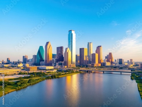 © Arunrat, Naklejka premium City skyline with modern skyscrapers reflecting on a river during golden hour.