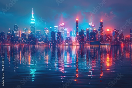 © Chanwit, Fototapeta premium City Skyline with Neon Light Streaks Vibrant neon light streaks