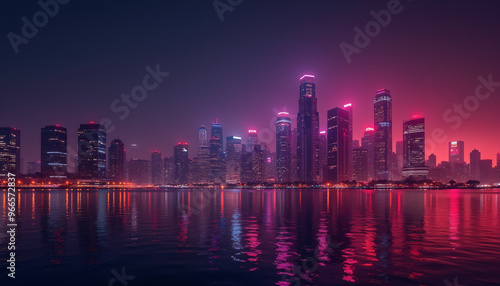 Fototapeta premium City Skyline with Neon Pink Reflections on Water