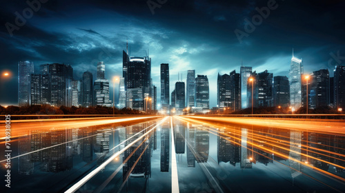 © Anoo, Obraz premium City Skyline With Skyscrapers and Lights Reflecting in Water
