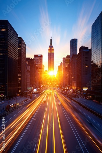 © Ai-Pixel, Fototapeta premium City skyline with sunset and light trails.