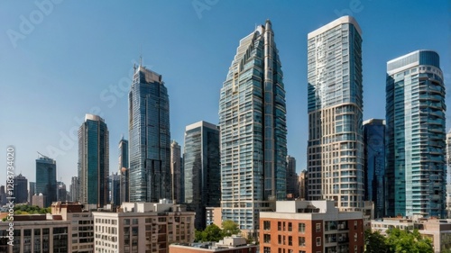 Fototapeta premium City Skyline with Tall Buildings Under Clear Sky in Daytime Featuring Modern...