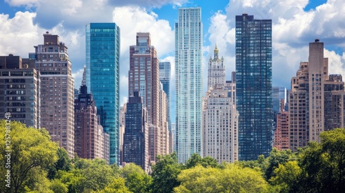© Santy Hong, Obraz premium City skyline with towering skyscrapers, blending steel, glass, and white exteriors