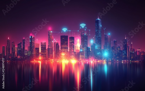 © Itsaree , Obraz premium City skyline with wifi symbols and digital network flows, representing the advanced infrastructure of a smart city, glowing lights, modern, sleek design