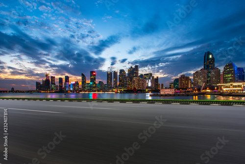 © zhouyilu, Naklejka premium City skyscrapers and road asphalt pavement