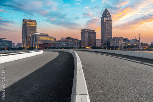 © zhouyilu, Naklejka premium City skyscrapers and road asphalt pavement